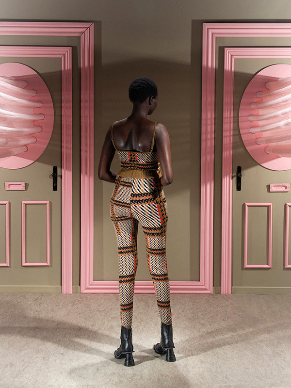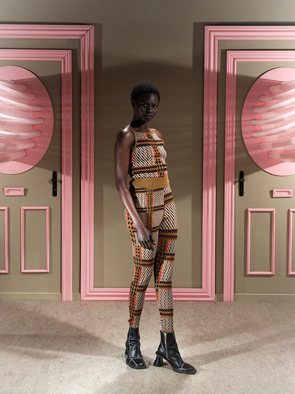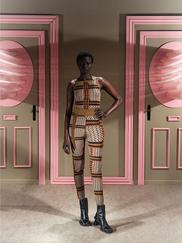 Dusk Knitted Pants in Orange Mixed Checks from Henrik Vibskov’s AW24 Studio Collection ‘Daily Chewing Gum Therapy’. Made in Bulgaria. Designer ID: AW24STUD-F705. Colour ID: 285 Orange Mixed Checks. We offer worldwide delivery. Duties & taxes paid. Shop now at Henrik Vibskov Boutique.