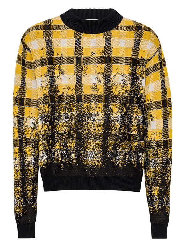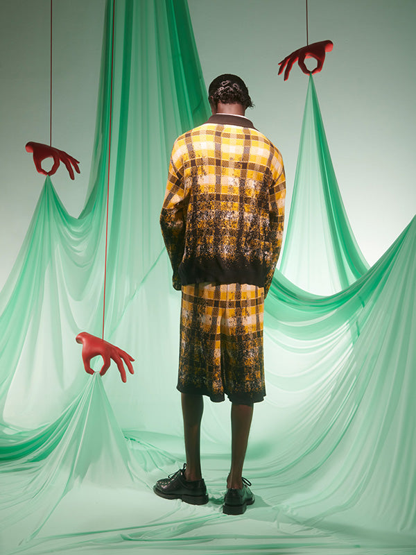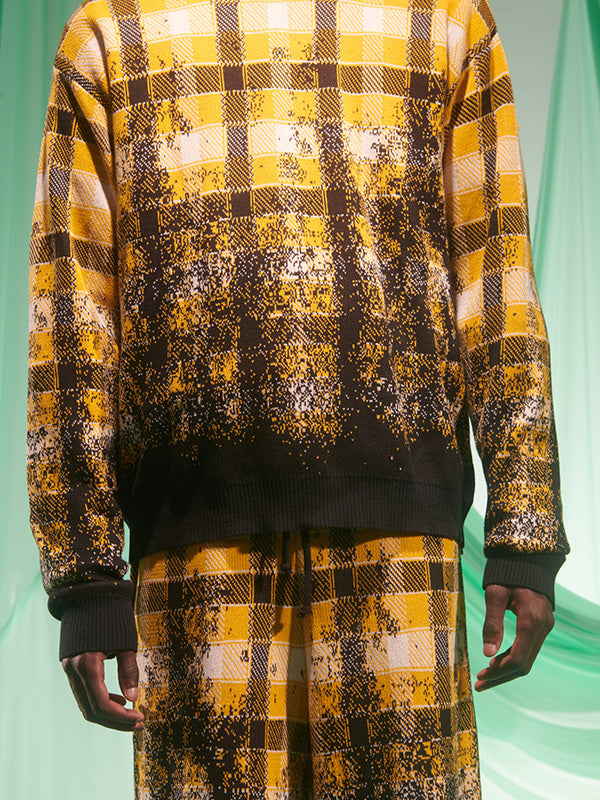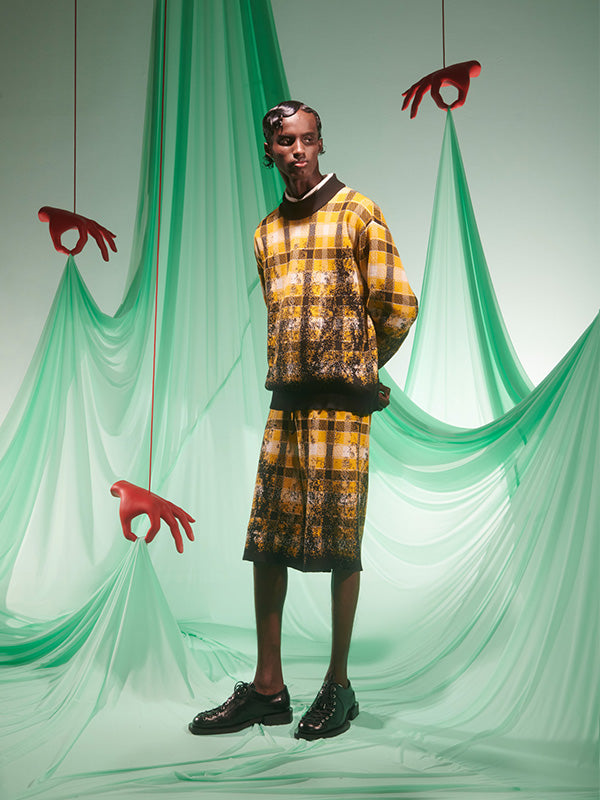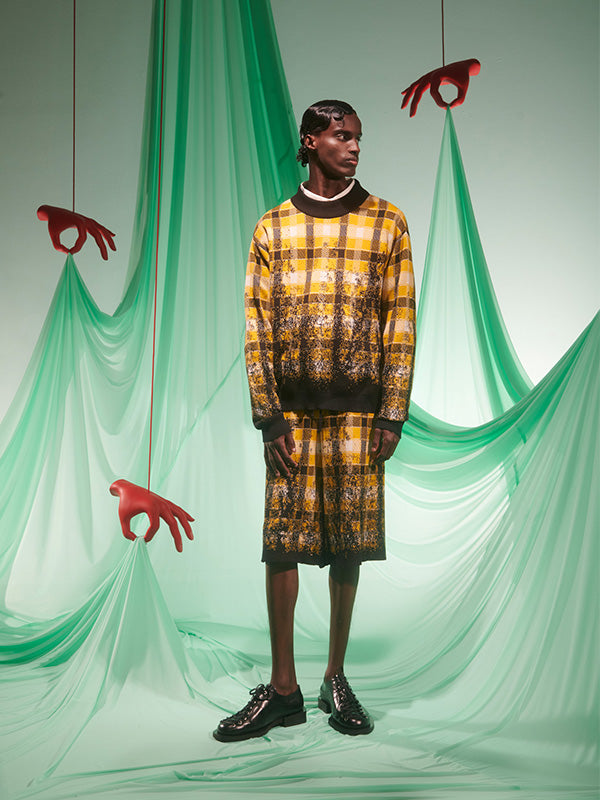 Faded Knit Jumper in Blurry Black Yellow Check from Henrik Vibskov’s SS25 Studio Collection ‘The Orchestra of the Soft Assistance’. Designer ID: SS25STUD-M706. Colour ID: 989 Blurry Black Yellow Check. We offer worldwide delivery. Duties & taxes paid. Shop now at Henrik Vibskov Boutique.