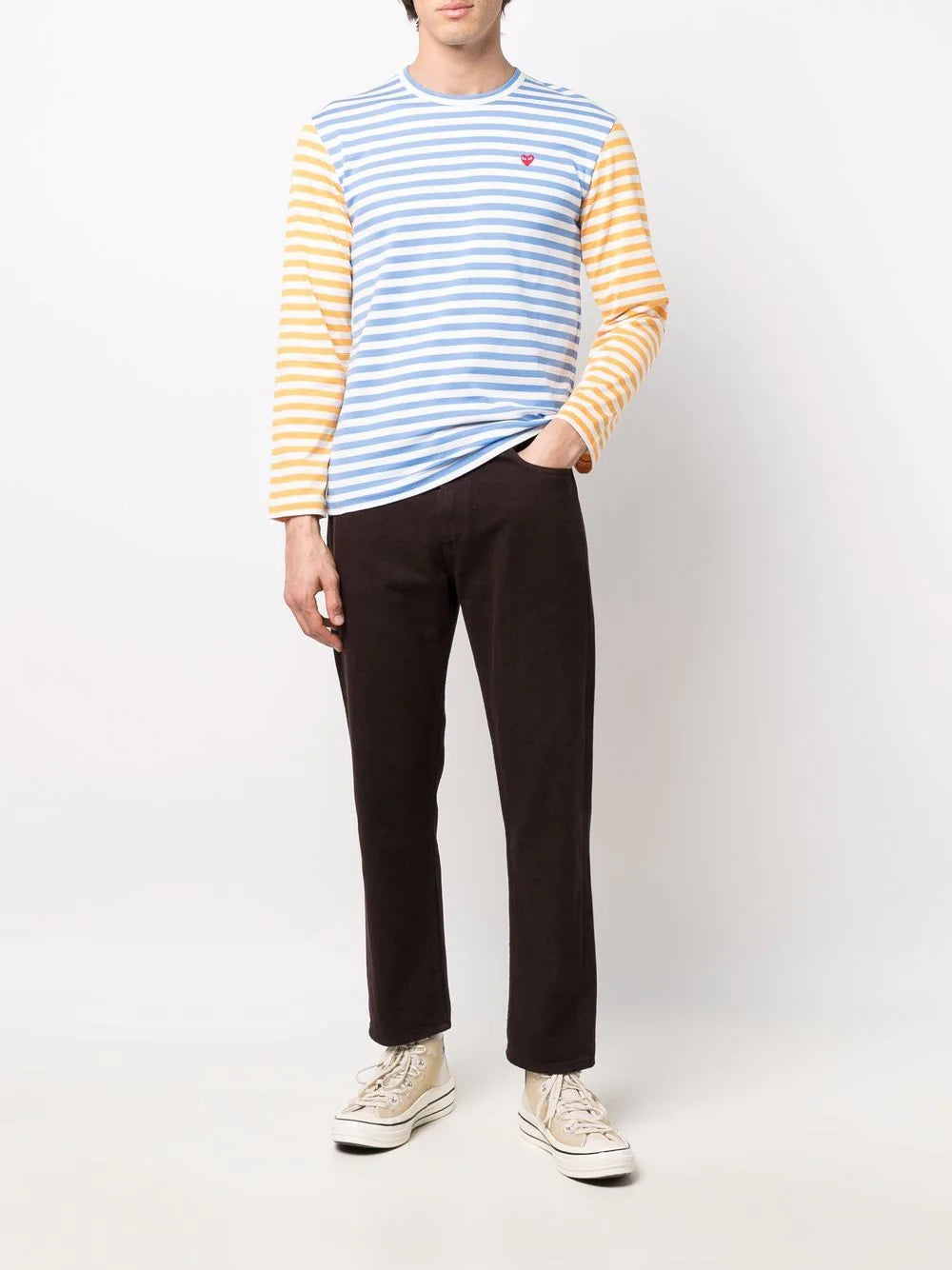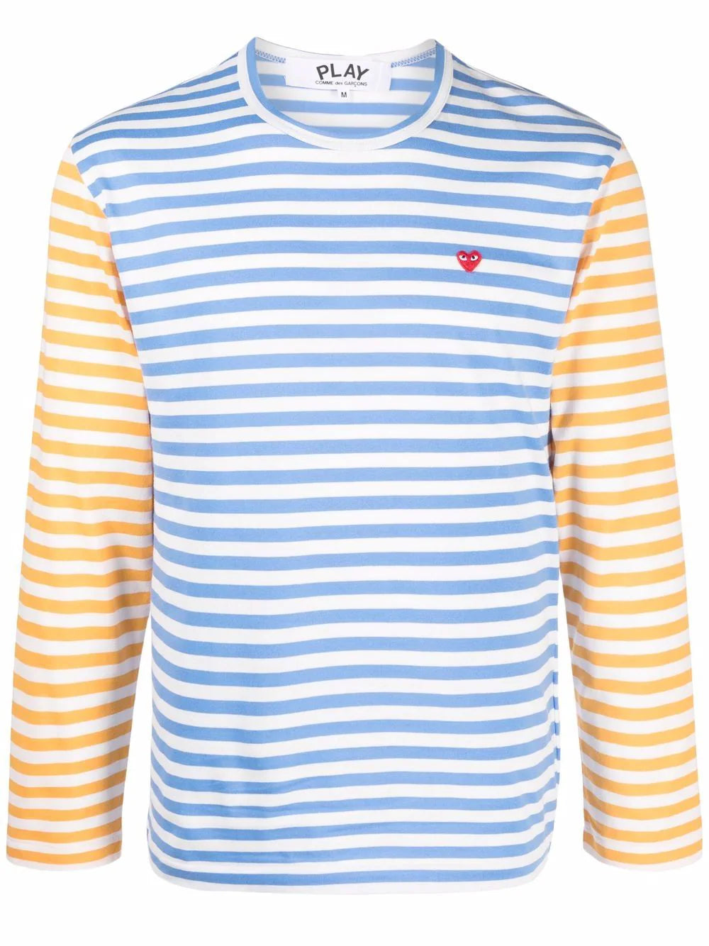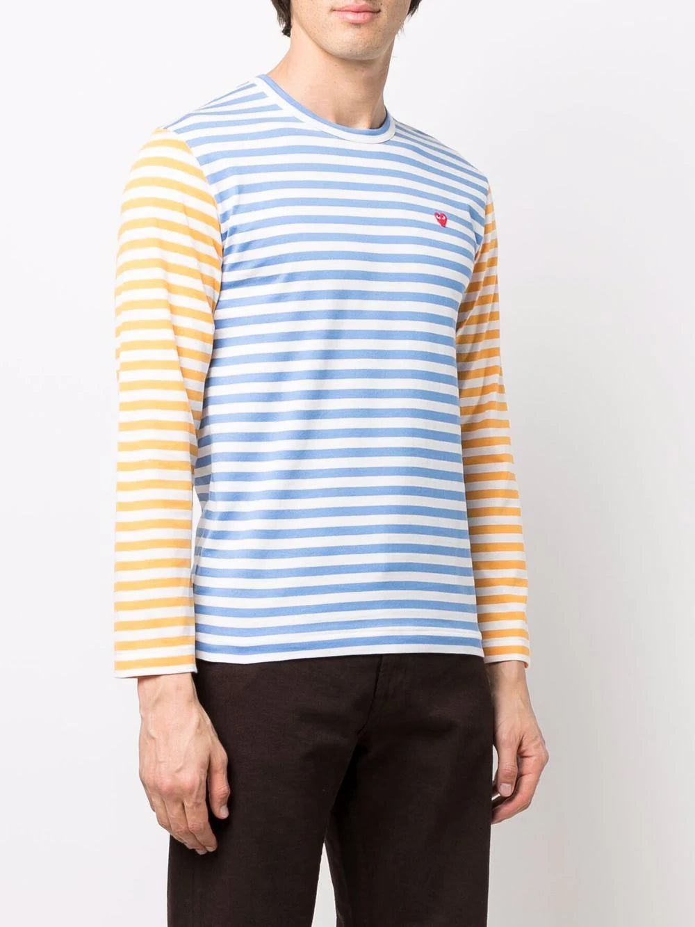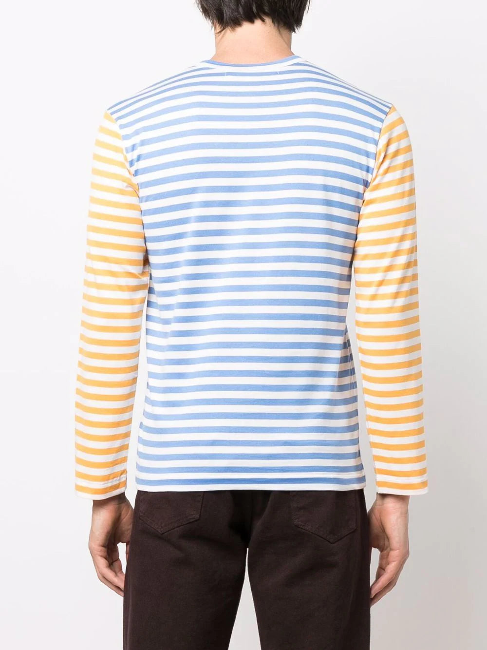 Mens Long Sleeves Tee Bi-Colour Striped in Blue/Yellow from Comme Des Garçons Play. Made in Japan. Designer ID: P1T318 Colour ID: Blue and Yellow Washing: Delicate wash 30C Degrees. We offer worldwide delivery. Duties and taxes paid. Shop now at Henrik Vibskov Boutique.