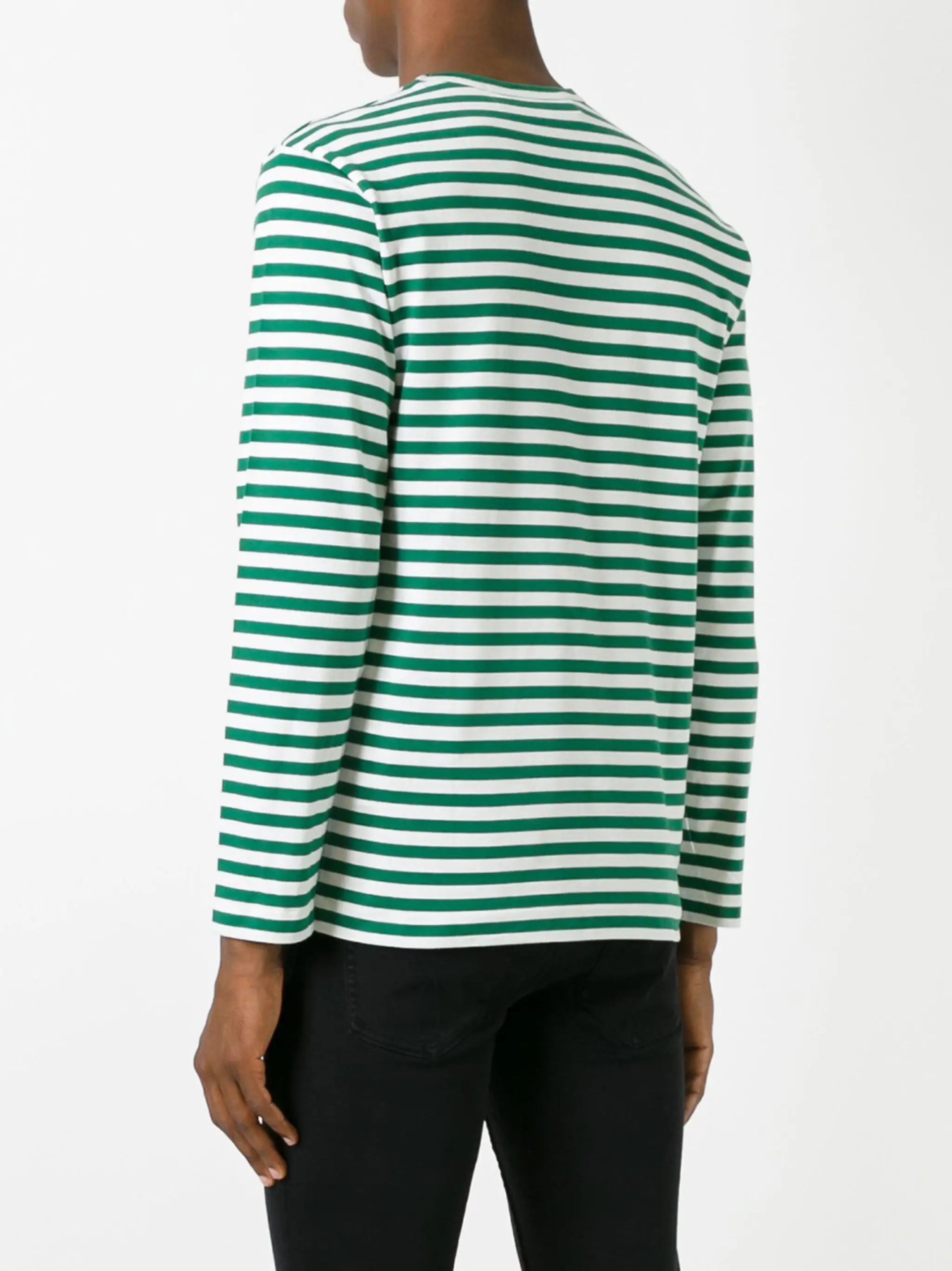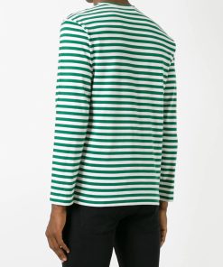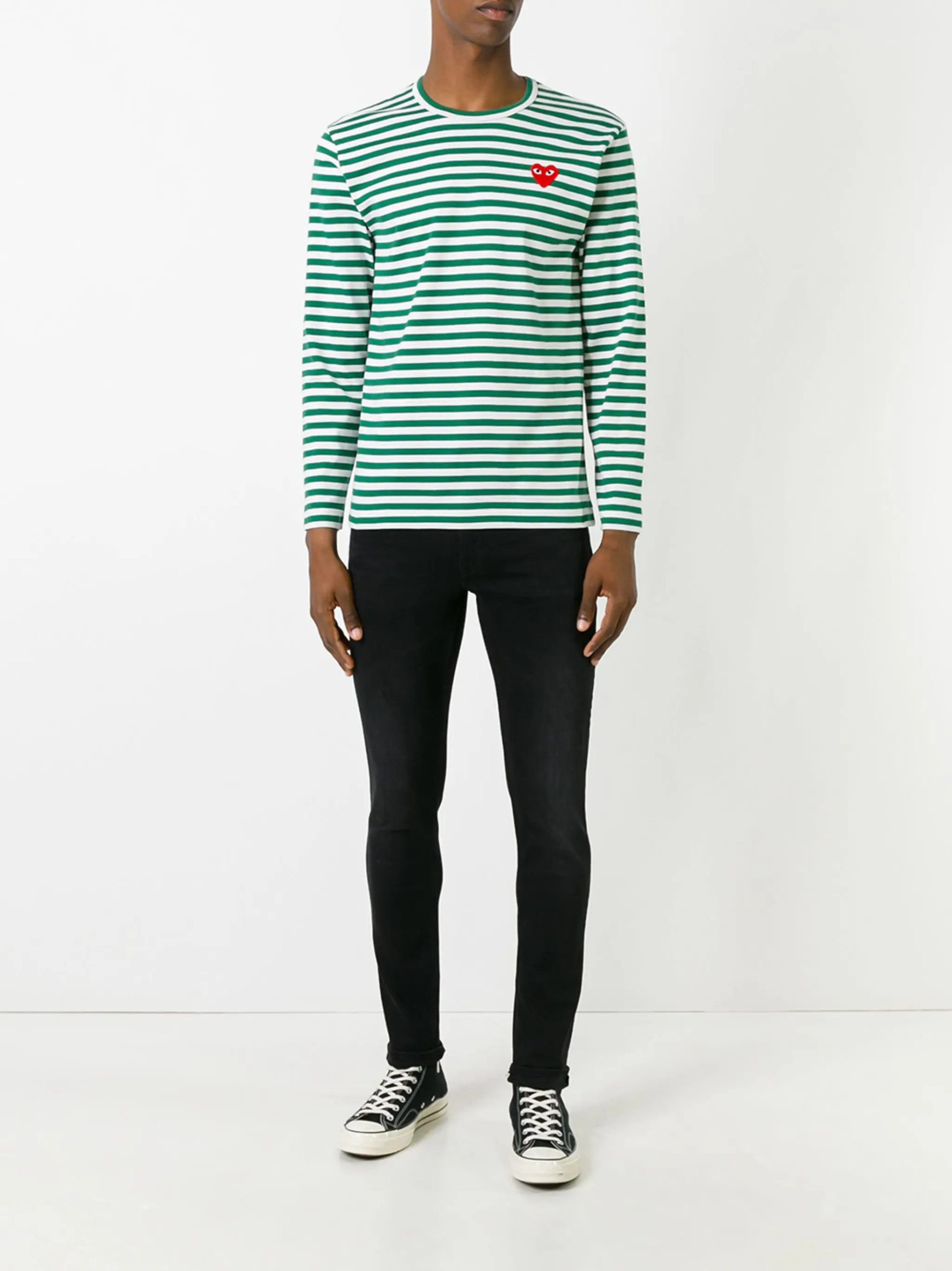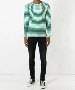 Unisex Striped Tee Red Heart in Green from Comme des Garçons Play. UNISEX STYLE. The model is wearing size M. Made in Japan. Composition: 100% Cotton. Designer ID: AX-T164-051. Color ID: Green. We offer worldwide delivery. Duties & taxes paid. Shop now at Henrik Vibskov Boutique.