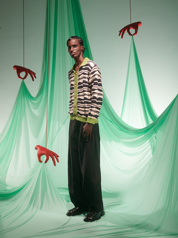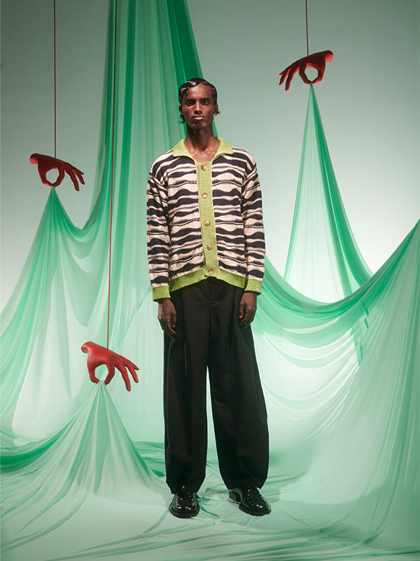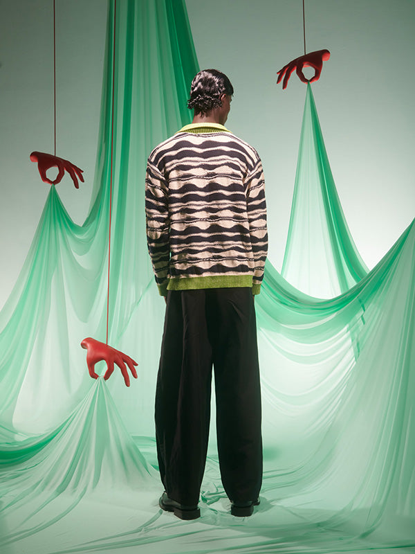 Wave Knit Cardigan in Beige Black Mountain Waves from Henrik Vibskov’s SS25 Studio Collection ‘The Orchestra of the Soft Assistance’. Designer ID: SS25STUD-M708. Colour ID: 120 Beige Black Mountain Waves. We offer worldwide delivery. Duties & taxes paid. Shop now at Henrik Vibskov Boutique.