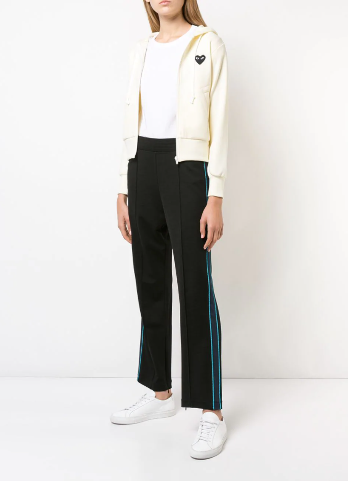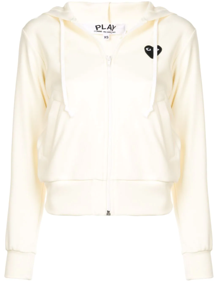 Womens Zipped Hoodie Black Heart in Ivoryfrom Comme Des Garçons Play. Featuring a front zip fastening, long sleeve, a cropped length and black heart design on the back. Designer ID: P1T253